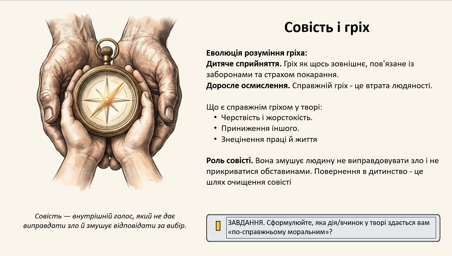 Це готовий матеріал для проведення змістовного уроку з акцентом на аналіз образів, двоплановість оповіді та ціннісні смисли кіноповісті-сповіді. Учні не просто “слухають”, а постійно працюють із запитаннями й висновками, порівнюють, аргументують, формують власну позицію.