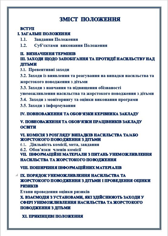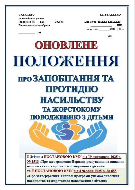 ПОЛОЖЕННЯ ПРО ЗАПОБІГАННЯ ТА ПРОТИДІЮ НАСИЛЬСТВУ ТА ЖОРСТОКОМУ ПОВОДЖЕННЮ З ДІТЬМИ. НАКАЗ ПРО ЗАТВЕРДЖЕННЯ П-НЯ (прописано ПОВНОВАЖЕННЯ ТА ОБОВ’ЯЗКИ