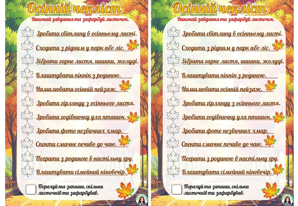 Пропоную Вам осінній чекліст для учнів. Можна запропонувати учням виконувати завдання на осінніх канікулах або протягом осінньої пори року. За кожне виконане завдання діти зафарбовують кленовий листочок навпроти завдання. Вкінці кожен підраховує скільки завдань він виконав та скільки листочків зафарбував.