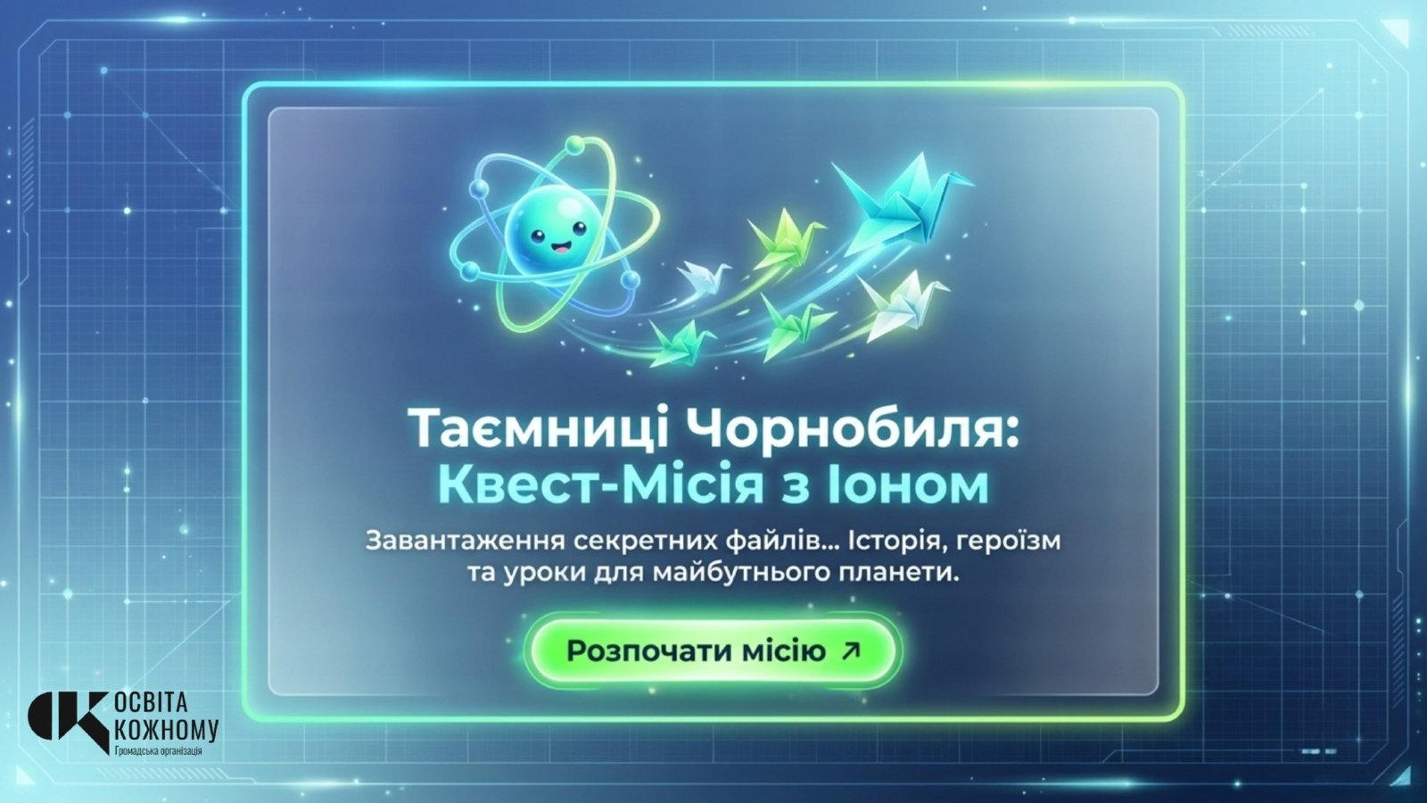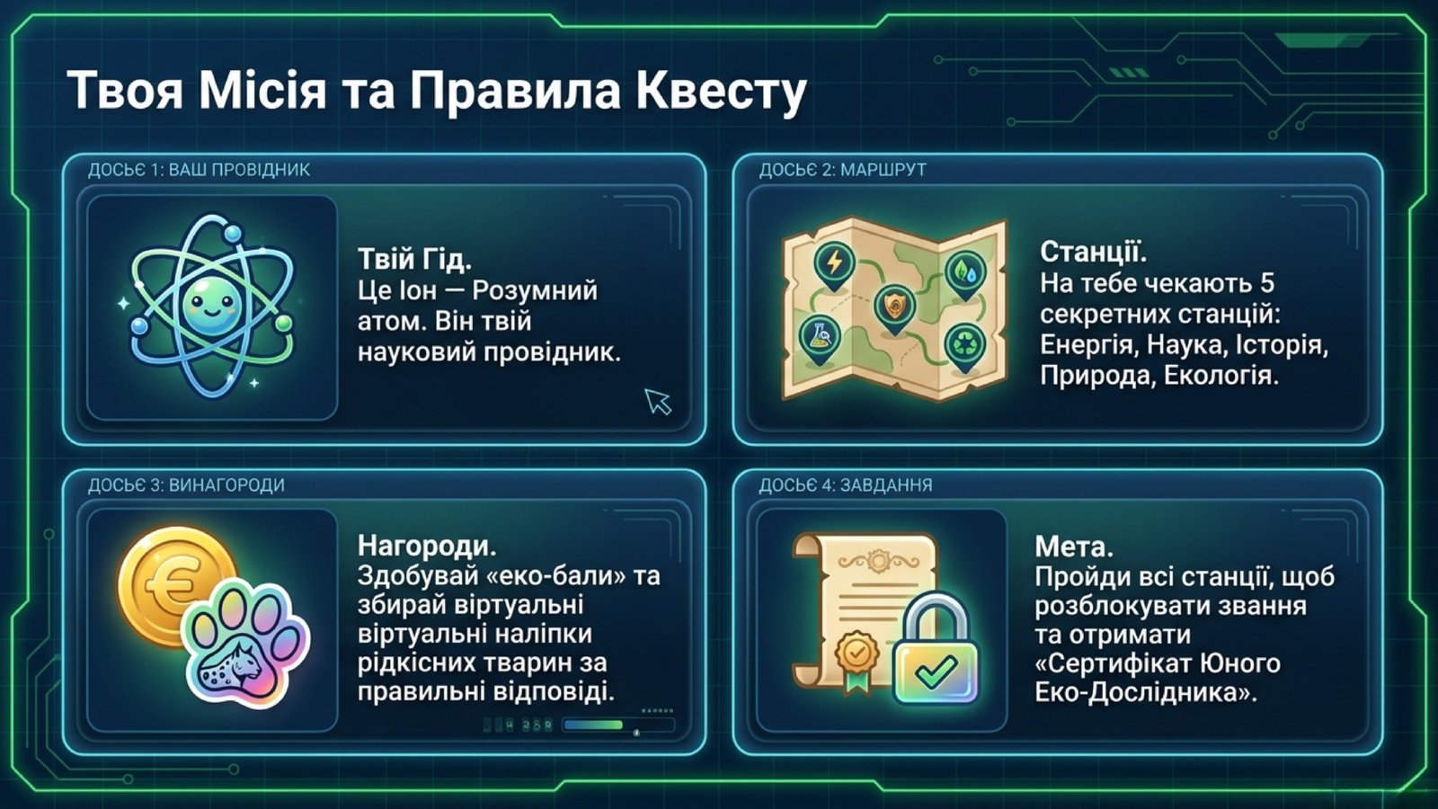 Інтерактивний квест-місія з Іоном: Цифрова лабораторія, де розумний атом Іон проводить учнів через 5 дослідницьких станцій: від роботи АЕС до екологічного кодексу майбутнього.