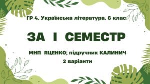 омплексна підсумкова робота з української літератури для 6 класу ГР 1, ГР 2, ГР 3, ГР 4 за МНП Яценко, за підручником Калинич. ЗА ПЕРШИЙ СЕМЕСТР!!!!!!