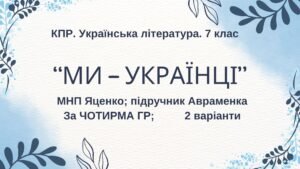 ГР 2. Підсумкова робота з української літератури для 7 класу “Ми – українці” (творчість Василя Симоненка, Валентини Матіїв, Іллі Чернілевського) (МНП Яценко, підручник Яценко).