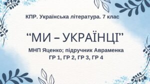 ГР 4. Підсумкова робота з української літератури для 7 класу “Ми – українці” (творчість Василя Симоненка, Валентини Матіїв, Іллі Чернілевського) (МНП Яценко, підручник Яценко).