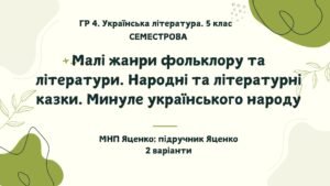 ГР 4. Підсумкова робота з укр літ за І СЕМЕСТР для 5 класу, за МНП Яценко, підручник Яценко. КПР охоплює розділи “Малі жанри фольклору та л-и”, “Народні та літературні казки”, “Минуле укр. народу”