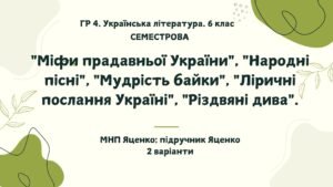 ГР 4. ПР з укр.літератури для 6 класу за МНП Яценко, підручником Яценко. Теми: “Міфи прадавньої України”, “Народні пісні”, “Мудрість байки”, “Ліричні послання Україні”, “Різдвяні дива”. 2 варіанти.