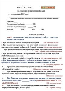 ПРОТОКОЛ ПЕДАГОГІЧНОЇ РАДИ ЛИСТОПАД 2025. ТЕМА. ПАРТНЕРСЬКА ВЗАЄМОДІЯ ШКОЛИ, СІМ’Ї ТА ГРОМАДИ У ВИХОВАННІ ДИТИНИ (50 сторінок)