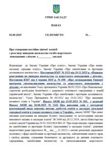 НАКАЗ “ПРО СТВОРЕННЯ ПОСТІЙНО ДІЮЧОЇ КОМІСІЇ З РОЗГЛЯДУ ВИПАДКІВ НАСИЛЬСТВА ТА ЖОРСТОКОГО ПОВОДЖЕННЯ З ДІТЬМИ У ЗАКЛАДІ ОСВІТИ” (6 сторінок)