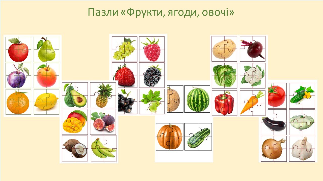 Пазли “Фрукти, ягоди, овочі” розроблені для дітей дошкільного та молодшого шкільного віку. Розробка на 6 аркушах А4 у форматі png.