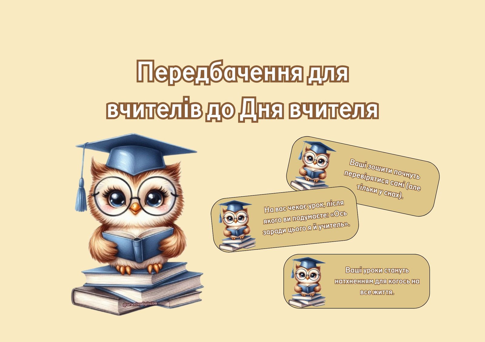 Матеріали «Передбачення до дня вчителя» будуть надіслані в електронному вигляді на вашу поштову скриньку одразу після оплати.