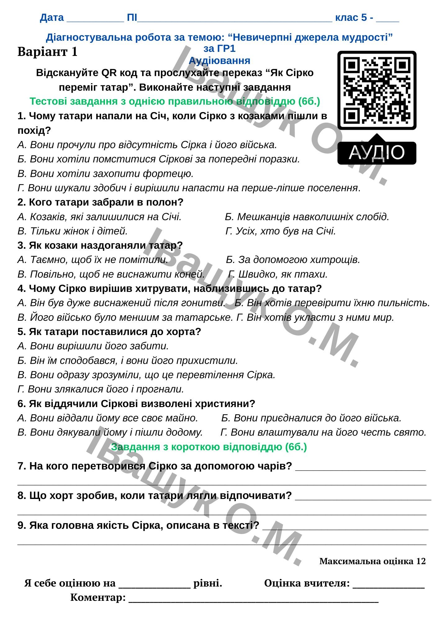 Комплексна підсумкова діагностувальна робота №1 за ГР1,2,3,4 за темою: «Невичерпні джерела мудрості»