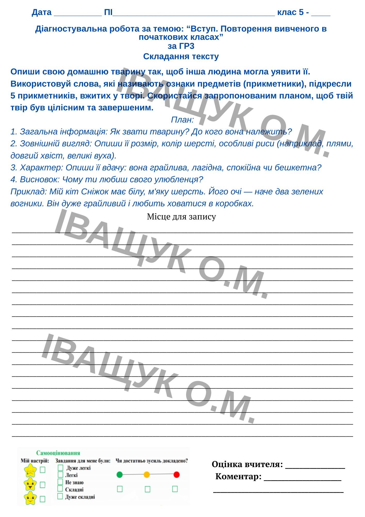Підсумкова діагностувальна робота №1 за ГР1 для 5 класу з української мови за темою: ВСТУП. ПОВТО...