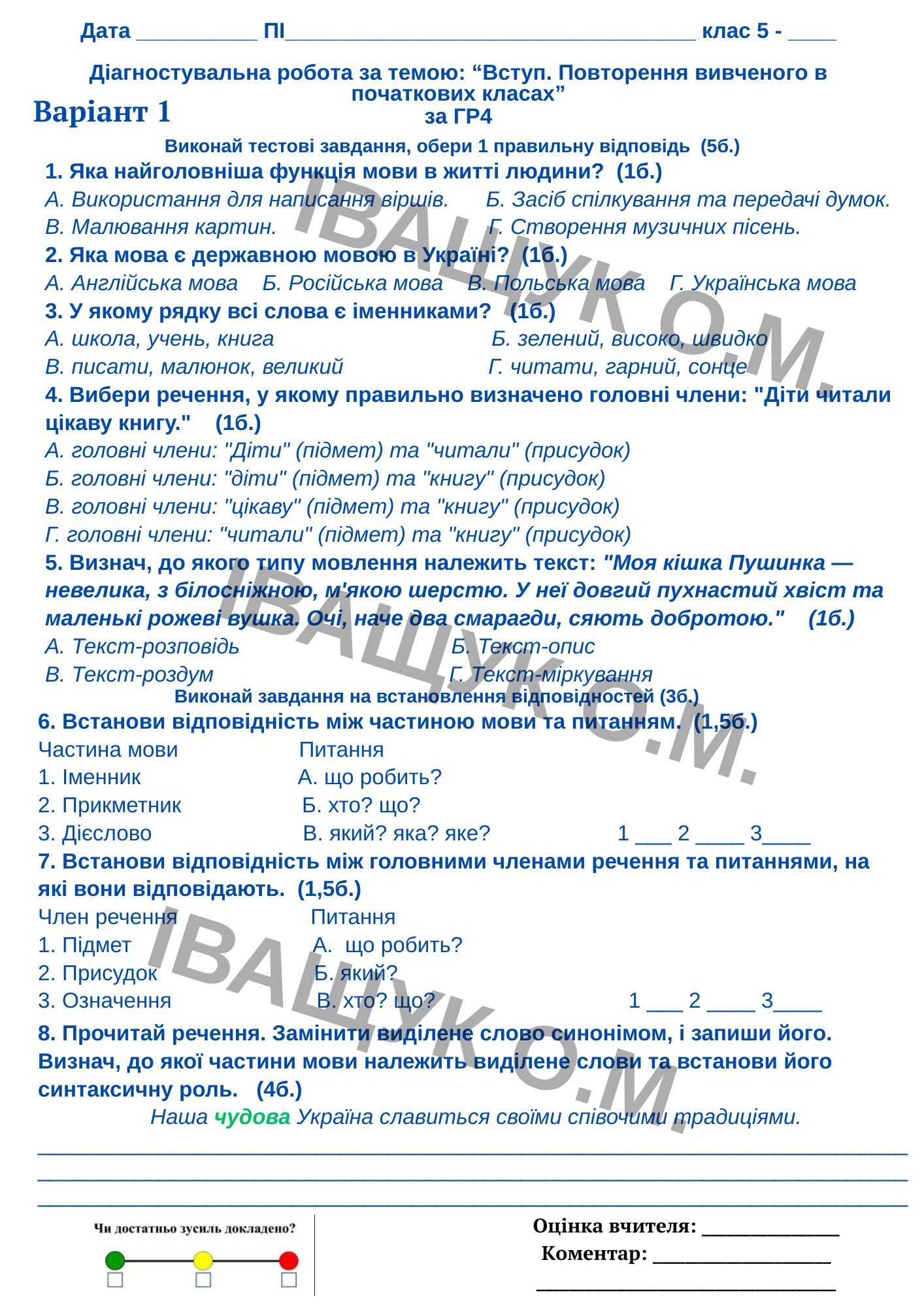 Підсумкова діагностувальна робота №1 за ГР1 для 5 класу з української мови за темою: ВСТУП. ПОВТО...
