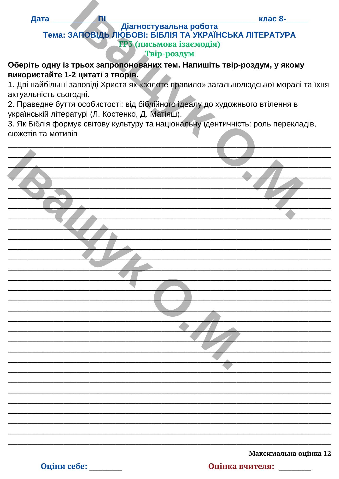 Щоб купити «Підсумкова діагностувальна робота №3 за ГР3 для 8 класу з української літератури за темою: ЗАПОВІДЬ ЛЮБОВІ: БІБЛІЯ ТА УКРАЇНСЬКА ЛІТЕРАТУРА», потрібно додати матеріал до кошика та оплатити замовлення.
