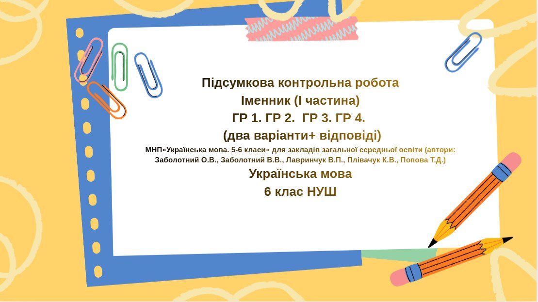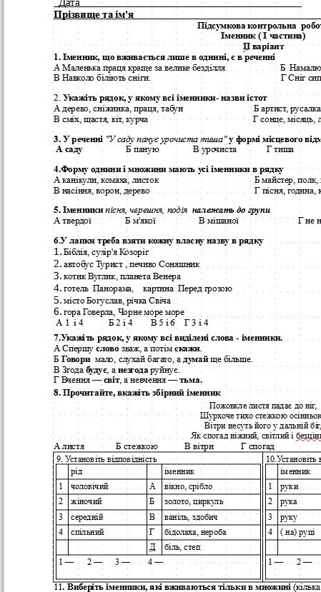 - Відміни іменниківКонтрольна робота складається із 16 різнорівневих завдань.Завдання 1- 8 мають по чотири варіанти відповіді, з яких лише один правильний