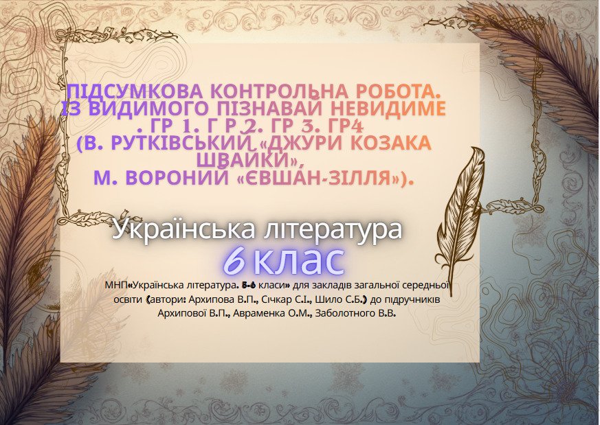 Матеріали «Підсумкова робота. За темою “Із видимого пізнавай невидиме “. ГР 1. Г Р 2. ГР 3. ГР4 (В. Рутківський, М. Вороний). Українська література 6 клас» будуть надіслані в електронному вигляді на вашу поштову скриньку одразу після оплати.