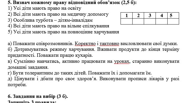 Робота складається з різних завдань до кожної групи результатів: тестові завдання, завдання на співвідношення та розгорнута відповідь. Кожне завдання має свою відповідну кількість балів, що полегшує роботу учителя та інформує учня.