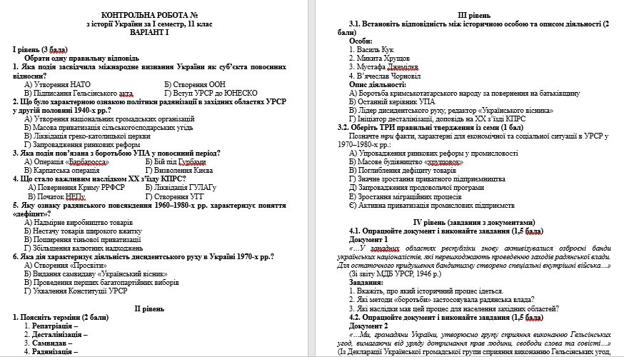Підсумкова контрольна робота за І семестр з історії України для 11 класу. Контрольна робота розроблена за навчальними рівнями.
