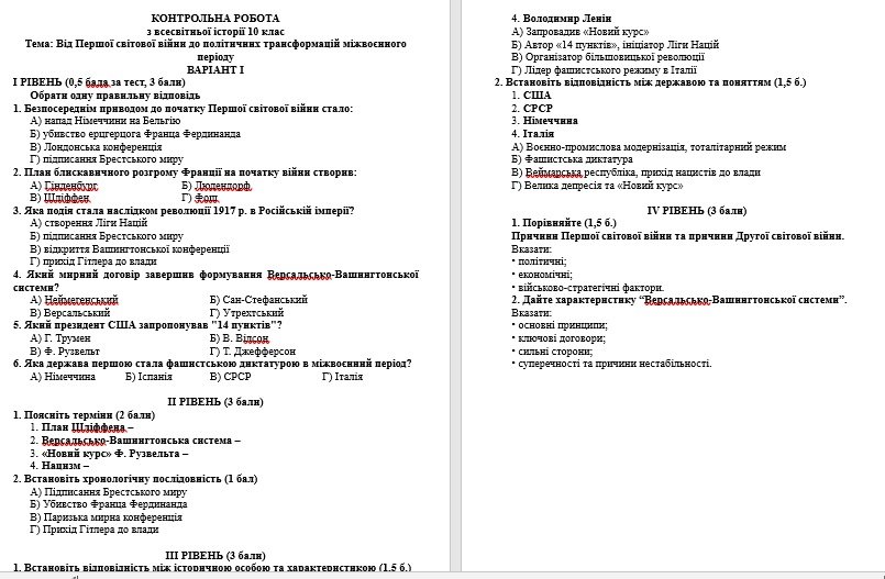 Підсумкова контрольна робота за І семестр з всесвітньої історії для 10 класу. Контрольна робота розроблена за навчальними рівнями. Містить два варіанти і відповіді до них.