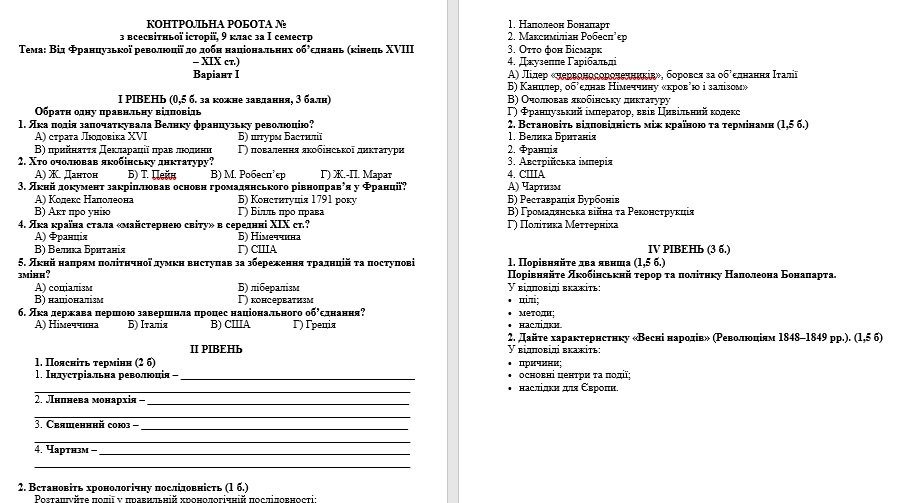 Підсумкова контрольна робота за І семестр з всесвітньої історії для 9 класу. Контрольна робота розроблена за навчальними рівнями.