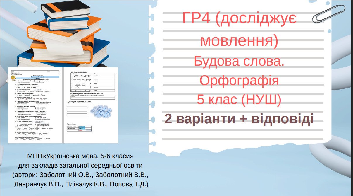 Як купити матеріал «Підсумкова робота. ГР 4 (досліджує мовлення) Будова слова. Орфографія. 5 клас. Українська мова.(НУШ) 2 варіанти + відповіді»?