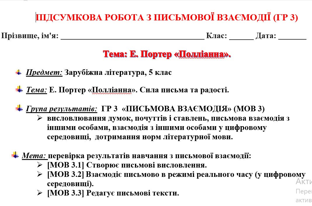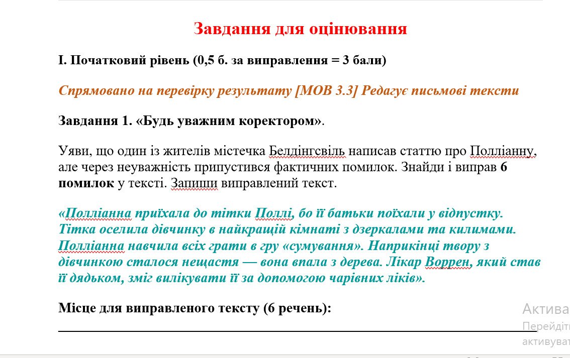 - Початковий рівень: Спрямовано на перевірку результату [МОВ 3.3] Редагує письмові тексти.