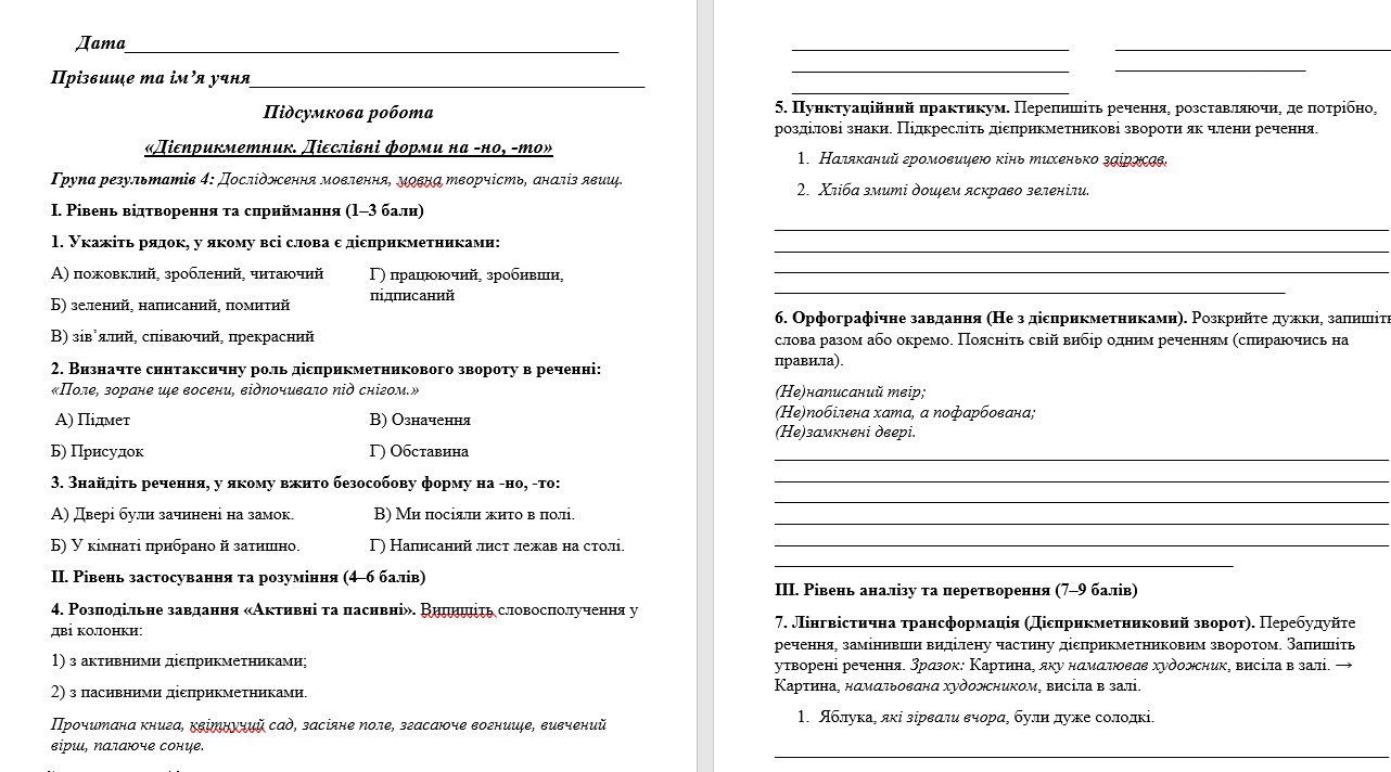 Початковий (1–3 бали): тести на розпізнавання дієприкметників та їх синтаксичної ролі.