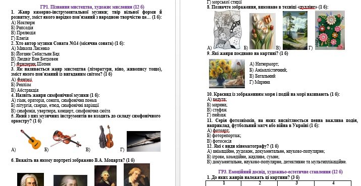 Комплексна діагностична робота з інтегрованого курсу “Мистецтво” складається із завдань із двох груп результатів ГР1 та ГР3 (ГР2 я оцінюю під час уроків). ГР1 включає 12 тестових завдань з музичного та образотворчого мистецтва по 1 балу кожен. ГР3 включає завдання на відповідності та відкриті питання, які передбачають короткі відповіді. (4 завдання по 3 бали кожне).