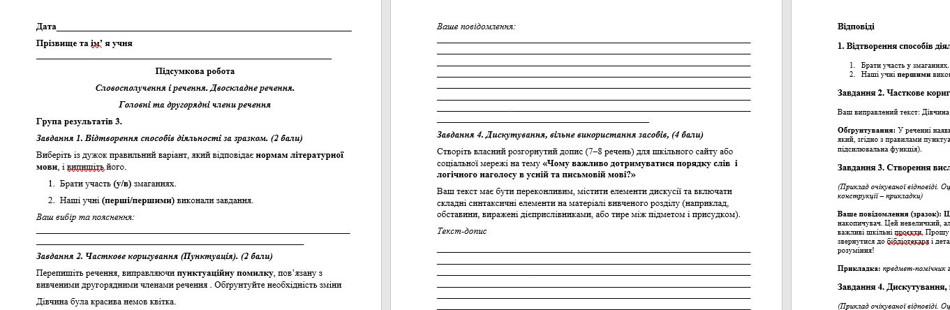 Робота розроблена відповідно до вимог Групи результатів 3 (Висловлювання думок, письмова взаємодія, дотримання норм) на матеріалі розділу «Словосполучення і речення. Головні та другорядні члени речення» (синтаксис).