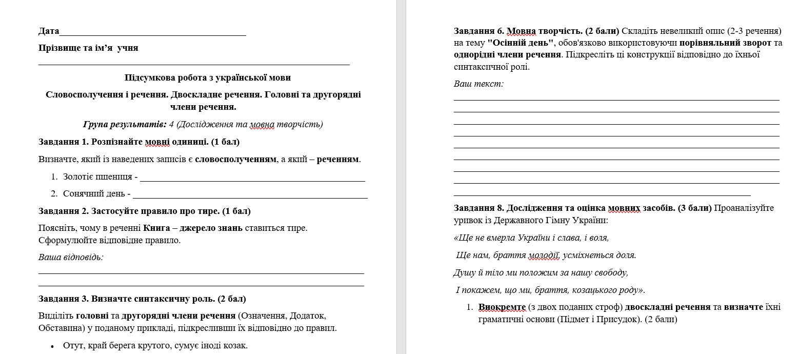 Підсумкова робота з української мови Словосполучення і речення. Двоскладне речення. Головні та другорядні члени речення. Група результатів: 4 (Дослідж