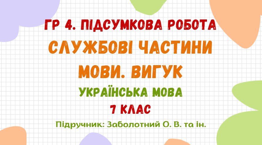 Підсумкова робота з української мови за ГР 4 “Досліджує мовлення” розроблена для учнів 7 класу, які вивчили тему “Службові частини мови. Вигук” (модельна навчальна програма «Українська мова. 7–9 класи» для закладів загальної середньої освіти (автори: Заболотний О. В., Заболотний В. В., Лавринчук В. П., Плівачук К. В., Попова Т. Д.)).