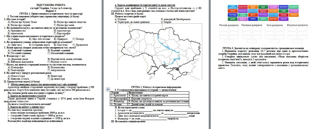 Підсумкова робота за І семестр з історії 5 клас автори Щупак, Власов за групами результатів. Робота містить два варіанти і відповіді до них.