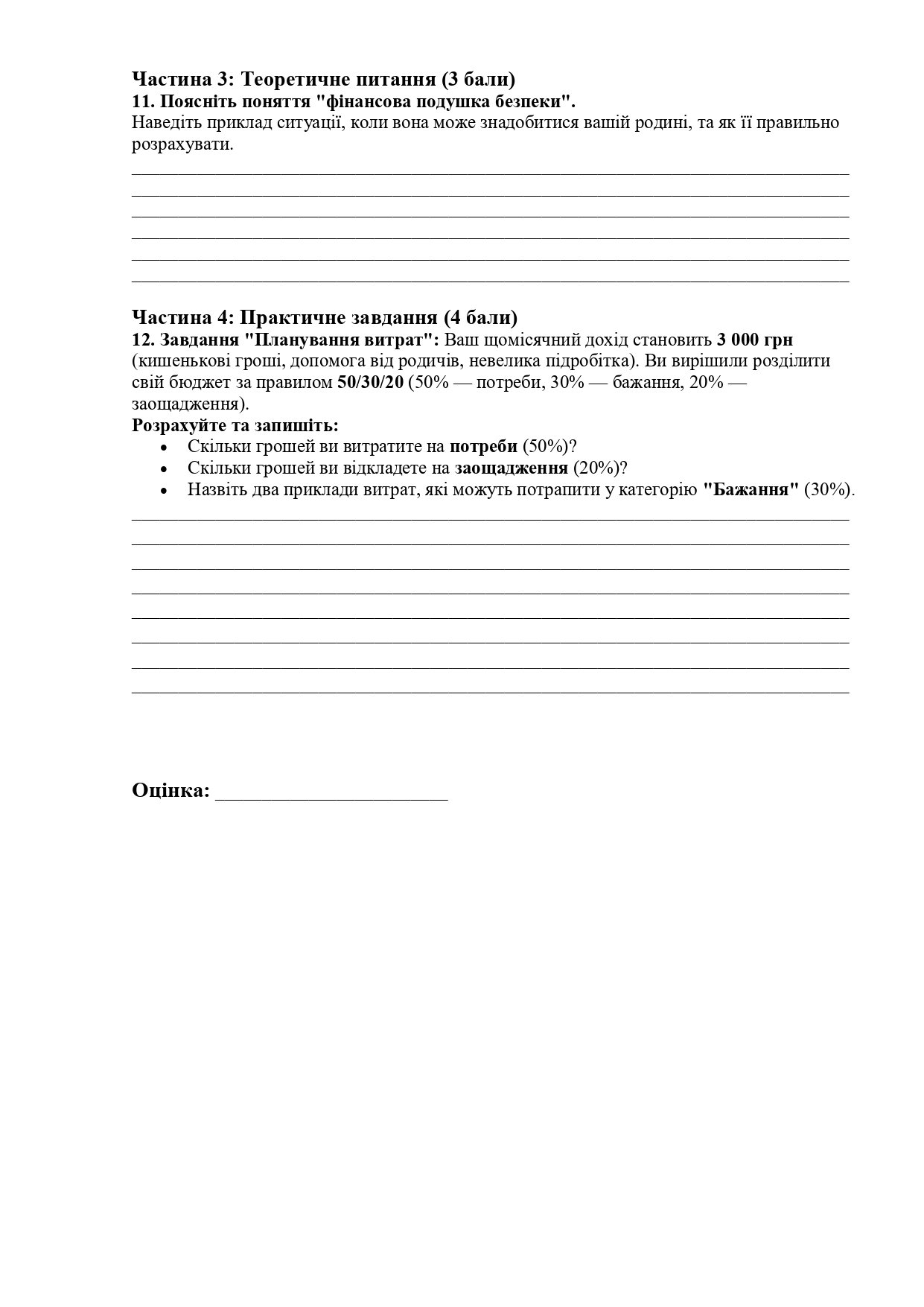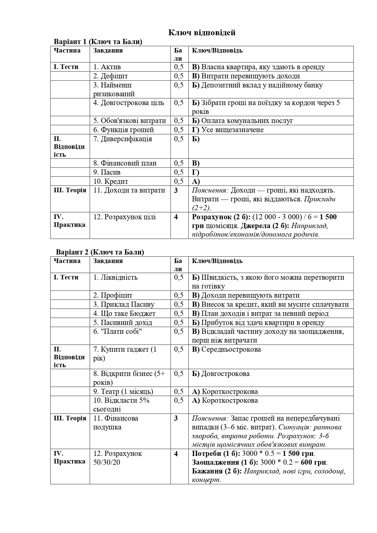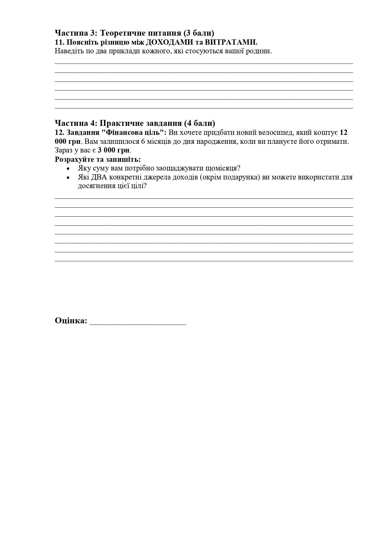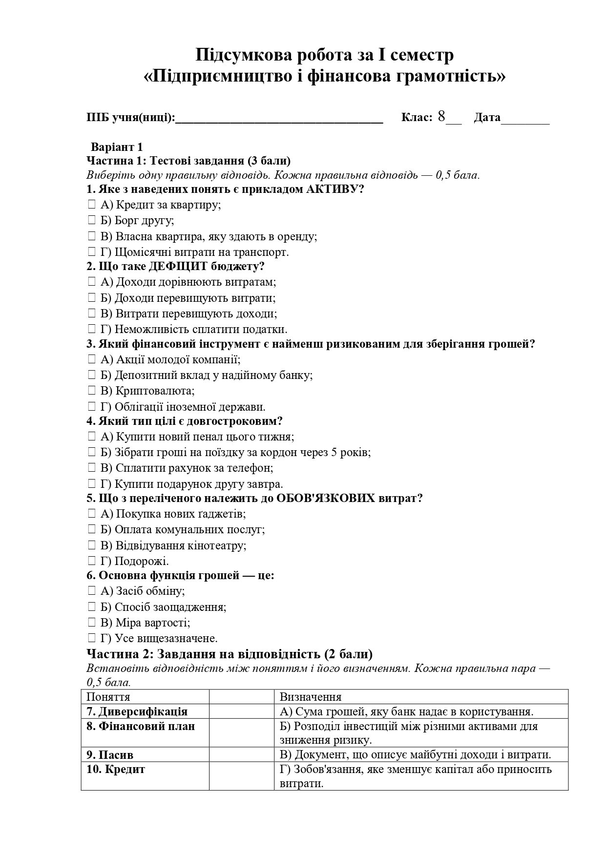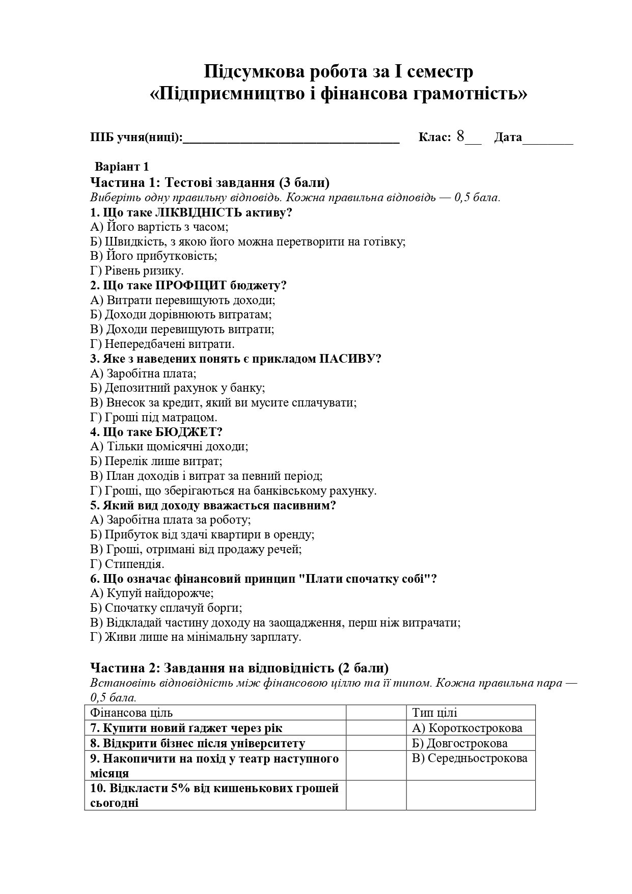 Пропоную бланки для друку підсумкової роботи за I семестр з «Підприємництва і фінансової грамотності» з варіантами відповідей. ( Включено теми: гроші, бюджет, фінансові цілі, банки. За Грущинська Н.)