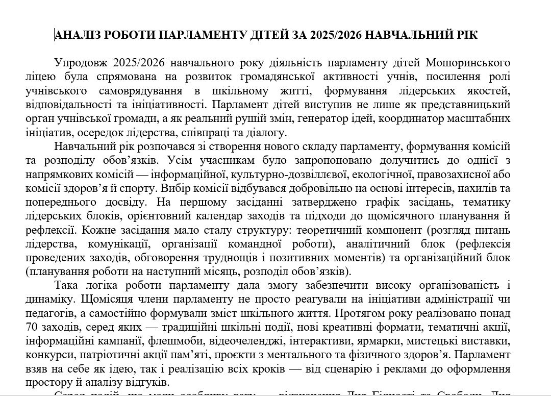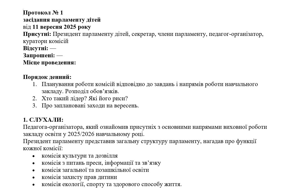 - ПЛАН РОБОТИ ПАРЛАМЕНТУ ДІТЕЙ НА 2025/2026 НАВЧАЛЬНИЙ РІК