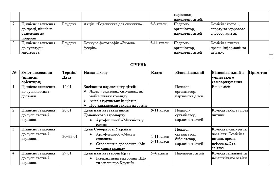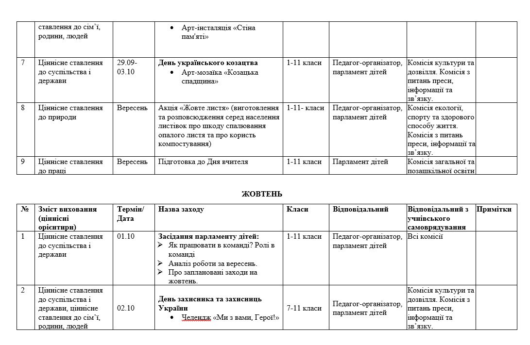 План складений по місяцях з урахуванням основних напрямів виховної роботи закладу освіти. Вказано тематику заходів, відповідальних педагогів та комісії парламенту дітей, Передбачено щомісячні засідання парламенту, які включають три постійні блоки: