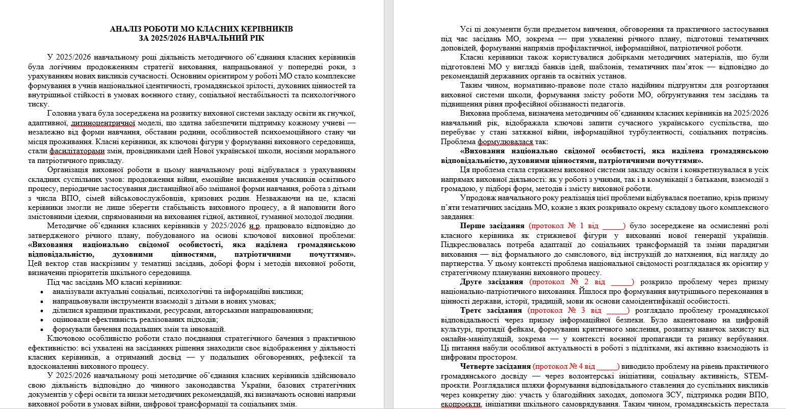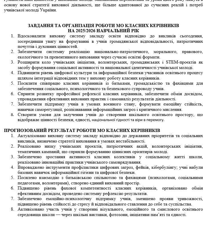 Папка МО класних керівників містить матеріали: Положення про МО, аналіз роботи МО за 2024/2025 н.р., функціональні обов’язки керівника МО, завдання та прогнозовані результати роботи МО на 2025/2026 н.р., план роботи МО на 2025/2026 н.р., графік показових виховних заходів класних керівників на І і ІІ семестр, протоколи засідань (5 шт.), + аналіз (звіт) роботи МО за 2025/2026 навчальний рік