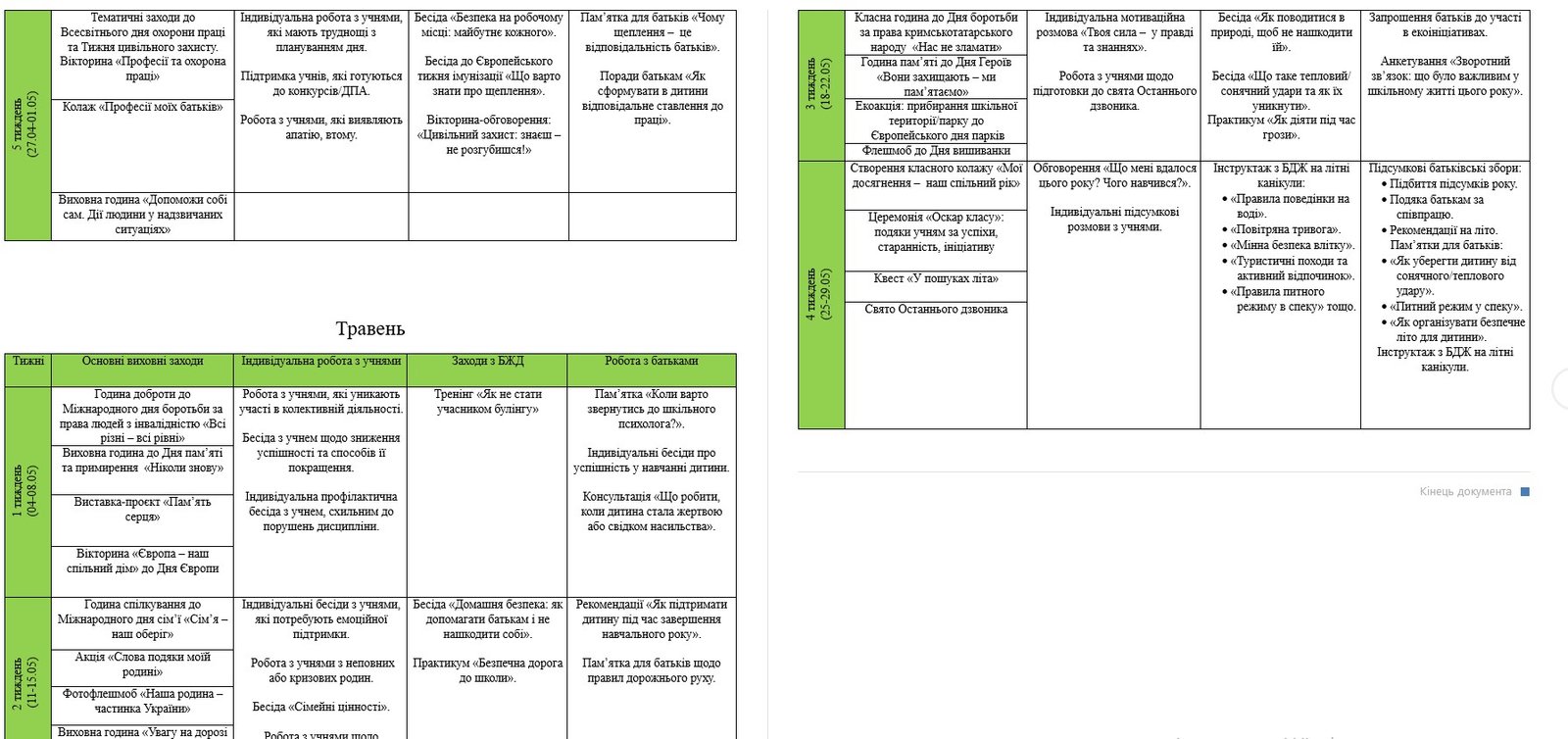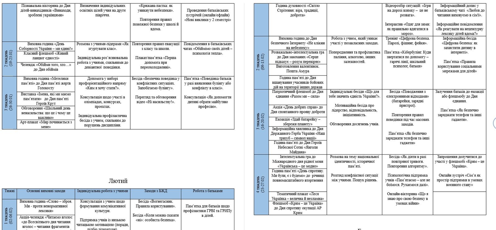 - Основні виховні заходи.