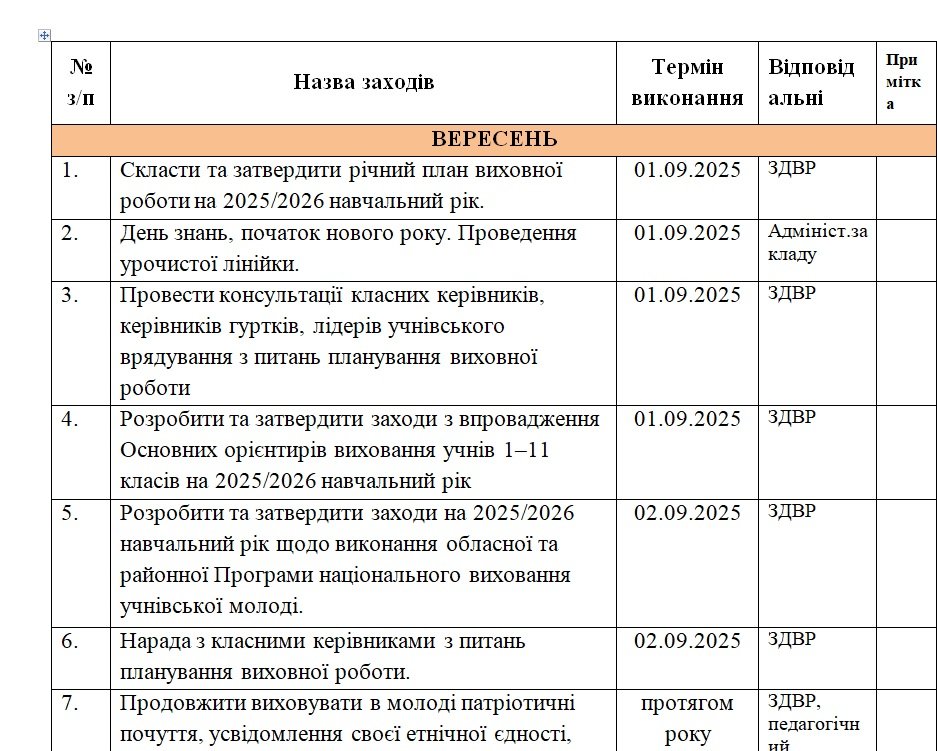 Річний план виховної роботи школи на 2025-2026 навчальний рік/План виховної роботи ЗДВР на 2025-2...