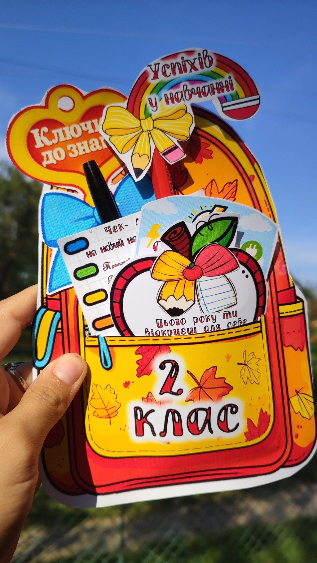 Пропоную креативний подарунок для дітей — яскравий рюкзачок з «ключем до знань» , веселими побажаннями та мотивуючими картками.