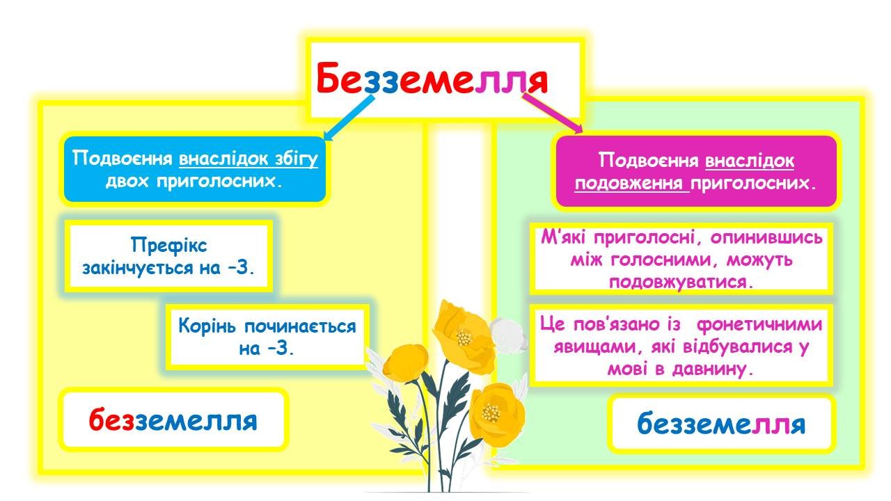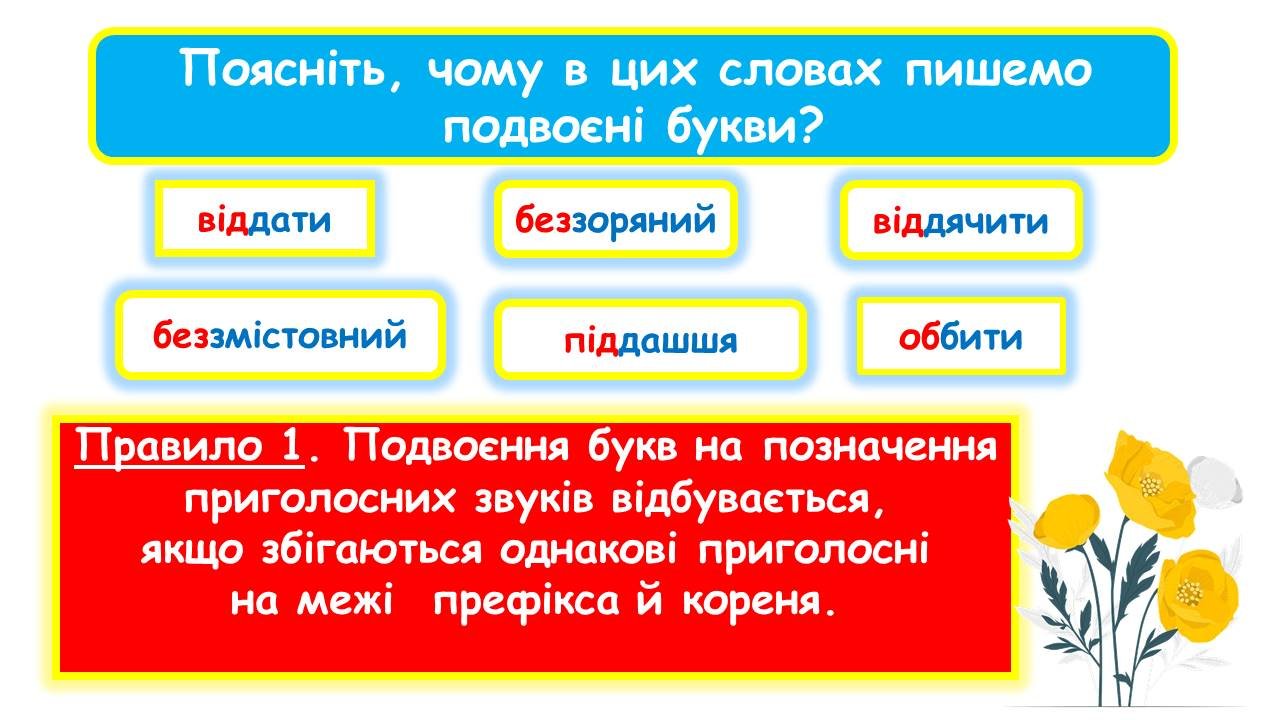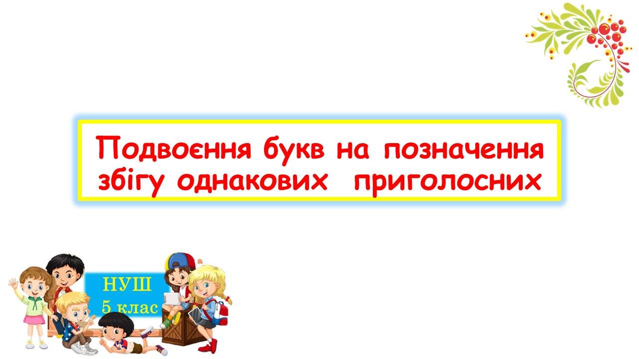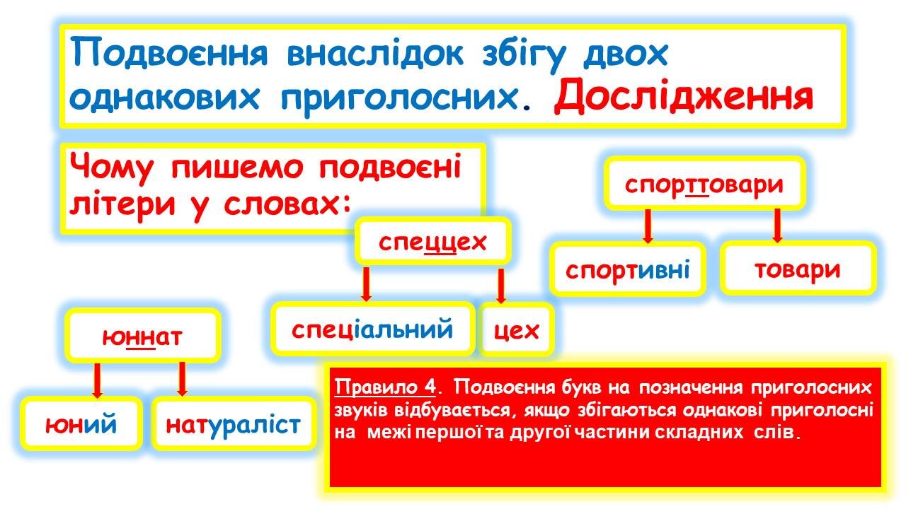 Подвоєння букв на позначення збігу однакових приголосних. Правила подвоєння приголосних внаслідок збігу на межі префікса і кореня, кореня і суфікса, частин слкладних слів. Приклади. Узагальнення матеріалу.