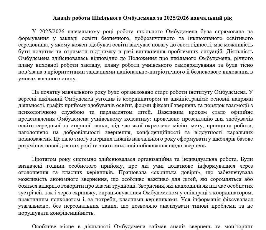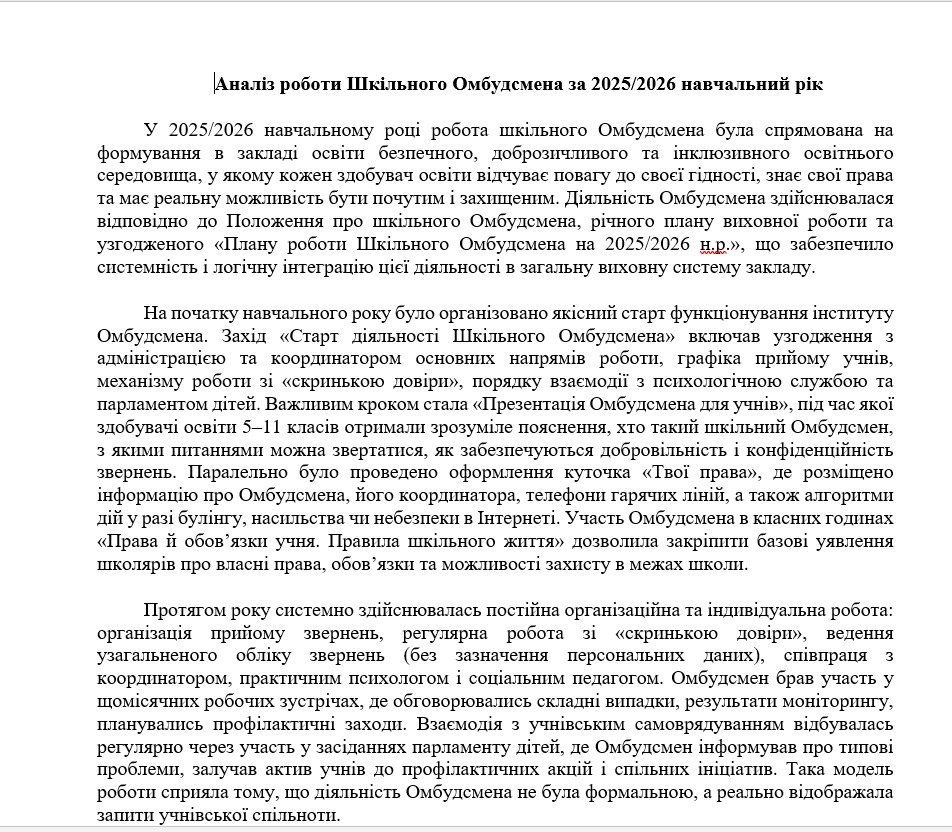 Детальний аналіз роботи Шкільного Омбудсмена за навчальний рік (2 варіанти) — загальний та з акцентом на проведені заходи: із логічною структурою, глибокими висновками й окресленими перспективами, які можна використати як готовий зразок або основу для власного звіту.