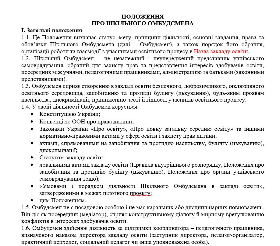 Положення про Шкільного Омбудсмена — чітко прописаний статус, місія, мета, принципи роботи, права й обов’язки омбудсмена, порядок обрання та звітності, адаптований до умов сучасної української школи та воєнного стану.