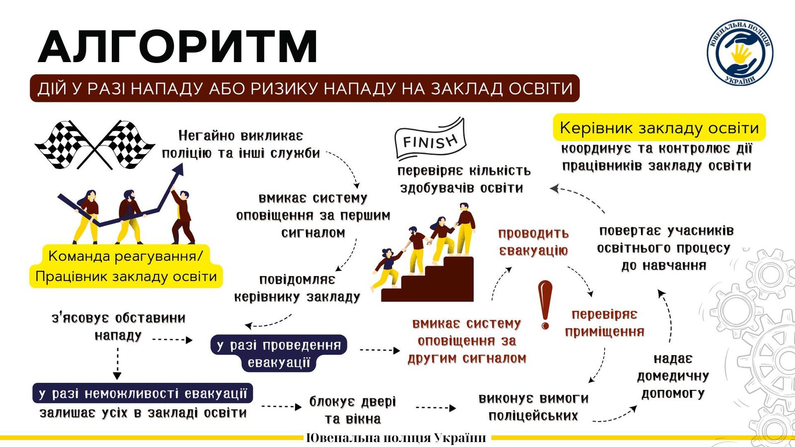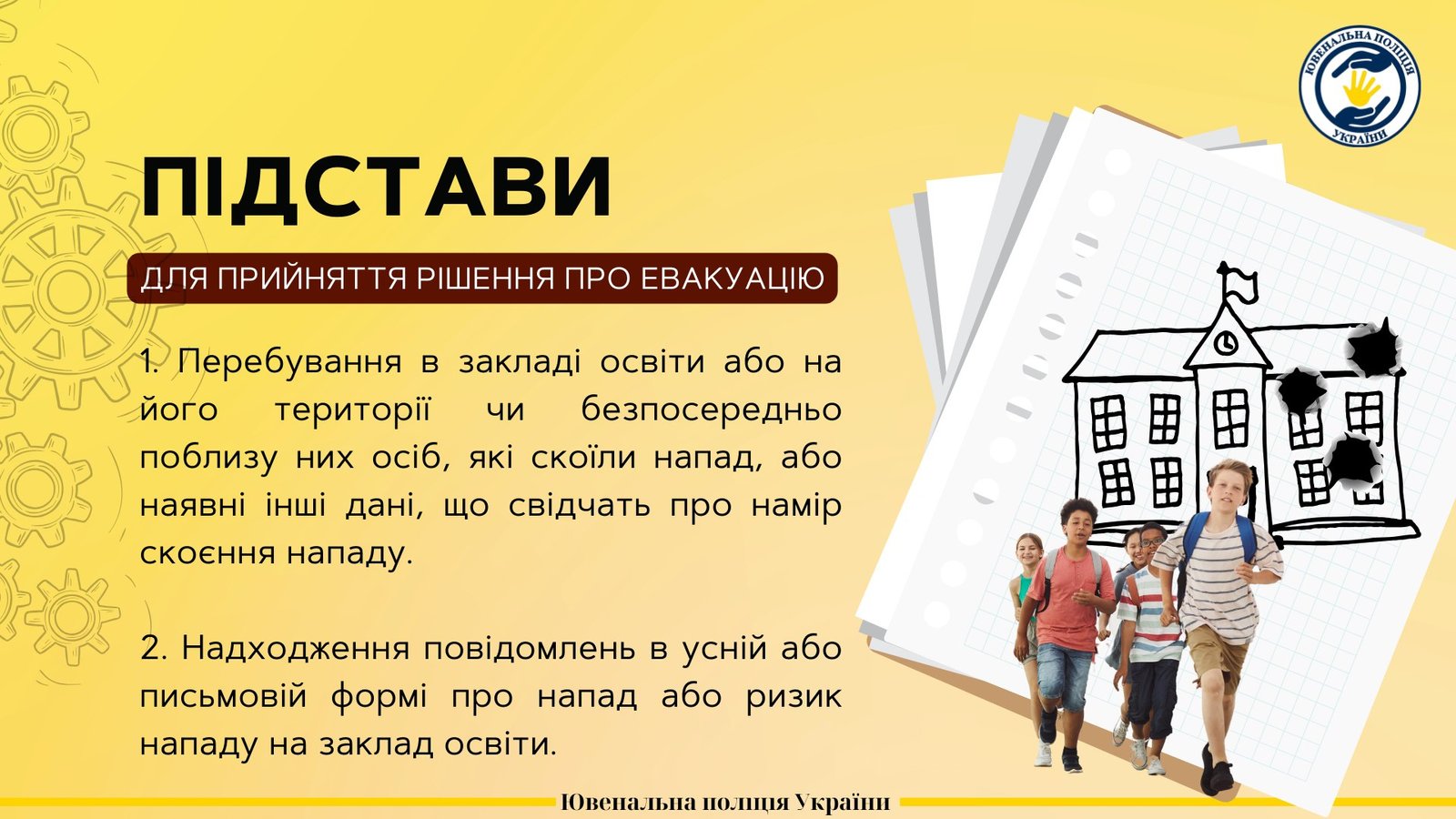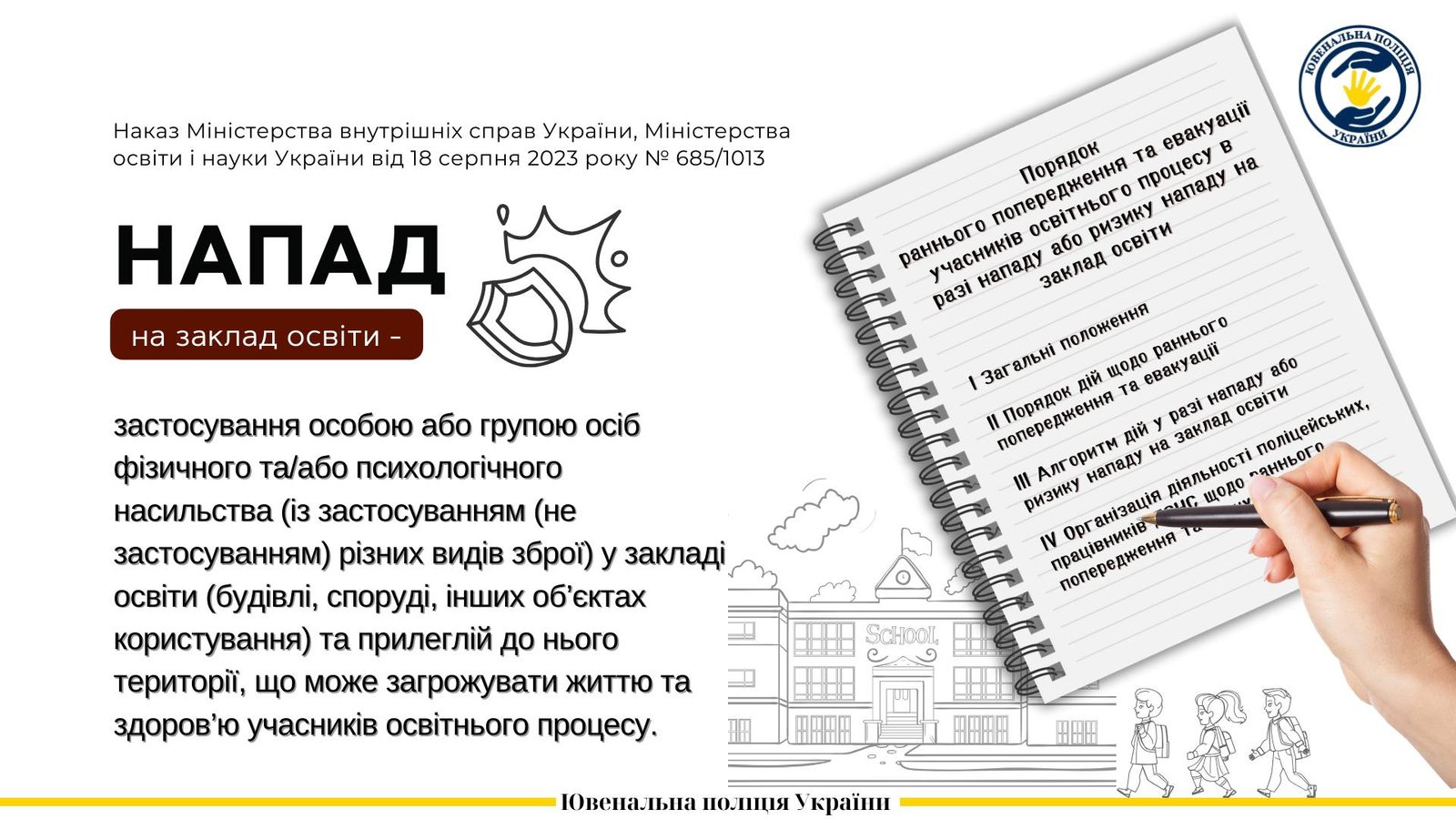 ✅ЗГІДНО з «Порядок раннього попередження та евакуації учасників освітнього процесу в разі нападу або ризику нападу на заклад освіти» Затвердженого наказом МВС УКРАЇНИ МОН УКРАЇНИ від 18.08.2023 № 685/1013 Із змінами і доповненнями, внесеними наказом МВС УКРАЇНИ, МОН УКРАЇНИ від 19 липня 2024 року N 497/1013