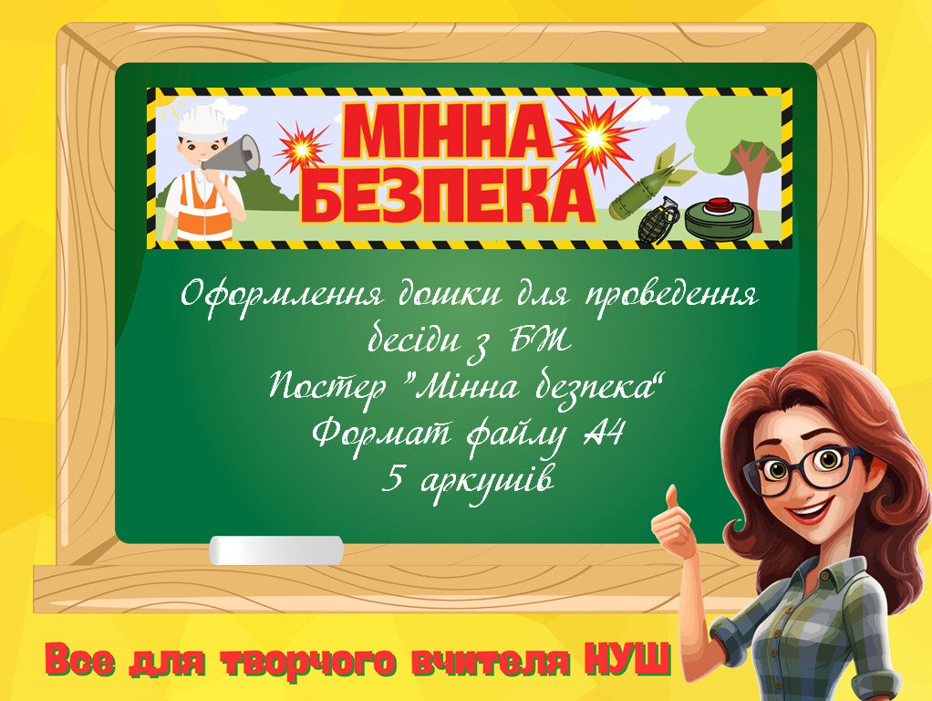 Оформлення класної дошки для проведення бесіди чи виховного заходу з безпеки життєдіяльності . Постер “Мінна безпека” . Формат файлу А4. Постер поділено на 5 аркушів. Яскравий дизайн та відмінна якість зображення.Формат файлу А4. Постер поділено на 5 аркушів. Яскравий дизайн та відмінна якість зображення.