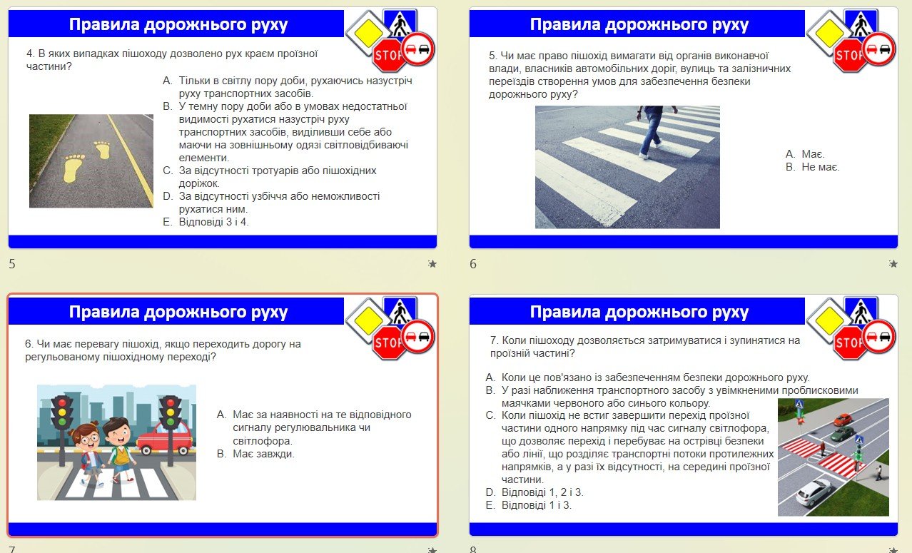 Презентація “Правила дорожнього руху” містить тестові питання для перевірки знань правил дорожнього руху для пішоходів та пасажирів. Презентація може бути використана на уроках курсу “Здоров’я, безпека та добробут”, під час проведення бесід з безпеки життєдільності.