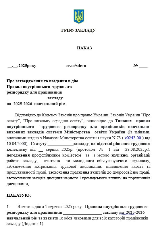 Матеріали «ПРАВИЛА ВНУТРІШНЬОГО ТРУДОВОГО РОЗПОРЯДКУ ДЛЯ ПРАЦІВНИКІВ ОСВІТНЬОГО ЗАКЛАДУ на 2025-2026 н.р-з урахуванням воєнного стану та гнучкого графіку роботи-» будуть надіслані в електронному вигляді на вашу поштову скриньку одразу після оплати.