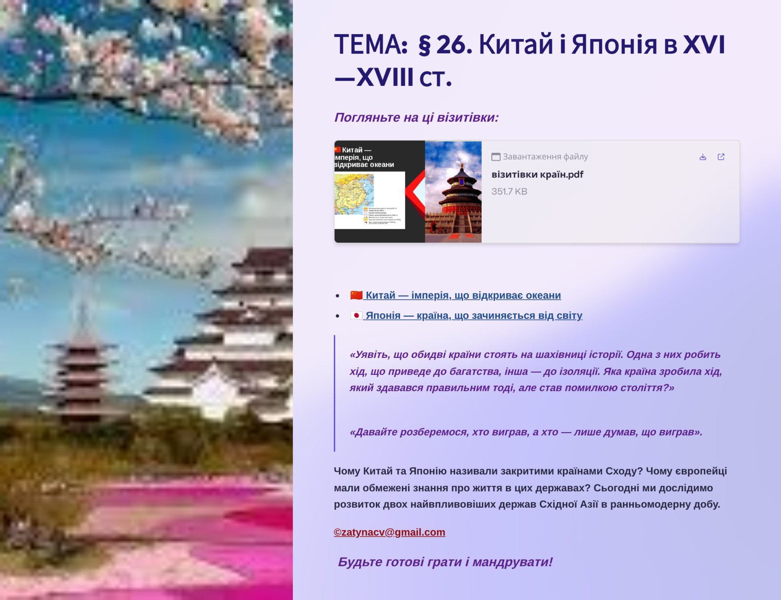 Коли я отримаю матеріал «Презентація 8 клас НУШ § 26. Китай і Японія в XVI—XVIII ст.»?