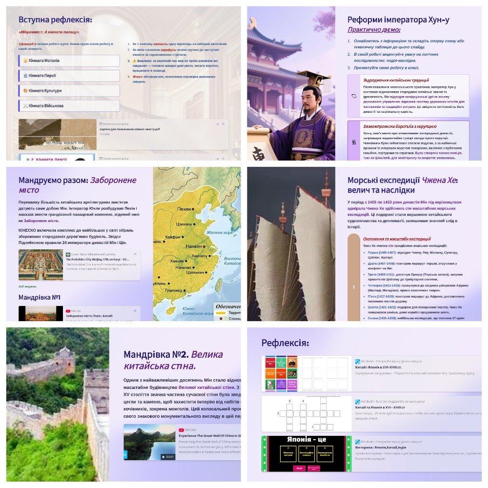 На ваших учнів чекають такі навчальні активності: мікроквест “4 кімнати палацу”, чотири мандрівки: 1) Заборонене місто; 2)Велика китайська стіна; 3) найбільша експедиція Чжена Хе; 4) мандрівка в сучасну і в давню Японію; а також іще багато цікавого.