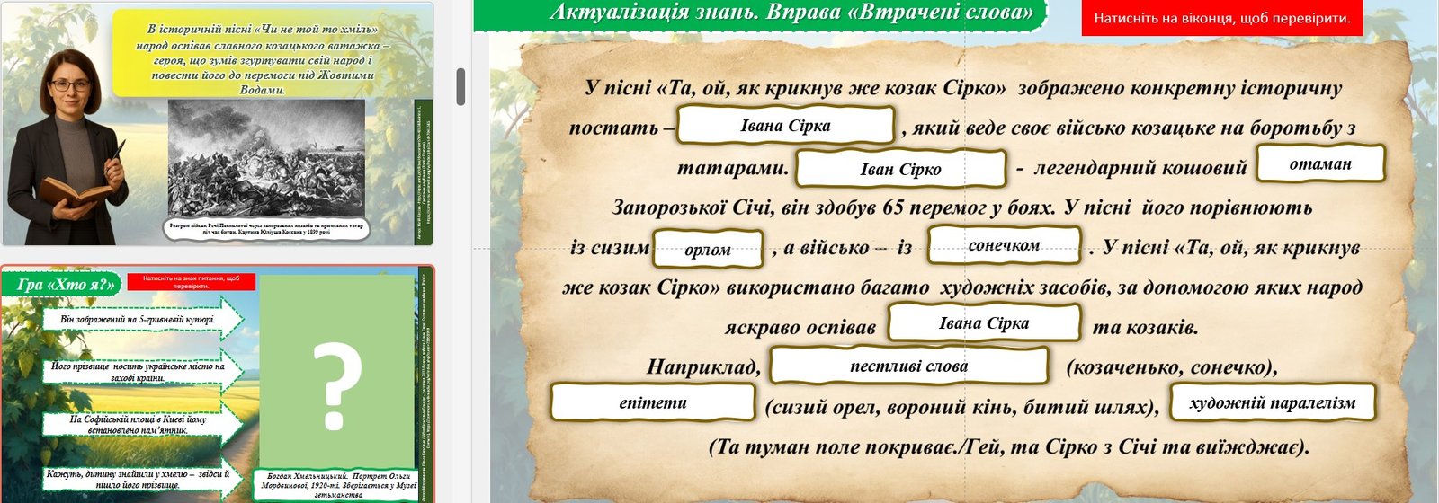 - Вправа «Втрачені слова» (з теми “Історична пісня “Та, ой, як крикнув же та козак Сірко”);