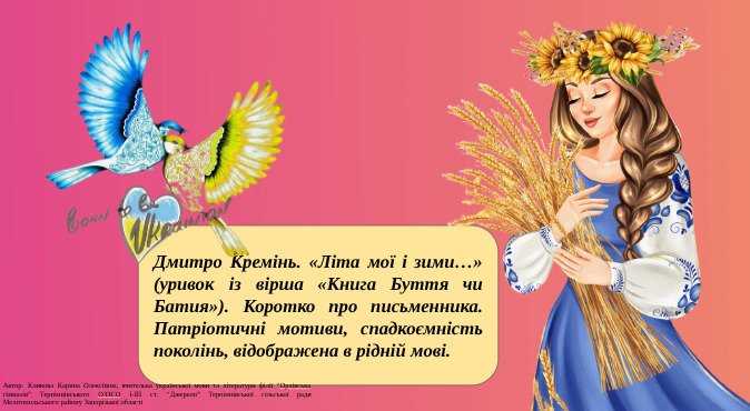 Презентація “Дмитро Кремінь. «Літа мої і зими…» (уривок із вірша «Книга Буття чи Батия»). Коротко про письменника. Патріотичні мотиви, спадкоємність п