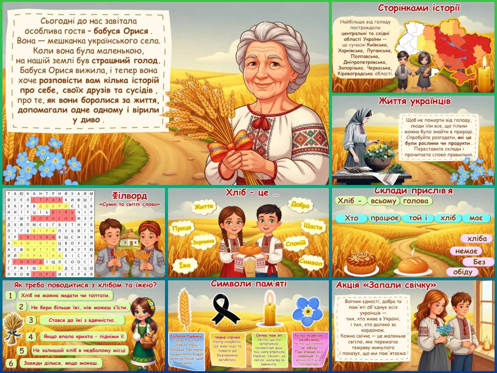 Презентація «День пам’яті жертв Голодомору» для учнів 2–6 класів створена з метою делікатно та доступно ознайомити учнів із трагічними подіями 1932–1933 років та виховати шану до історії свого народу. Матеріал подано у формі, зрозумілій молодшим школярам: через бесіду, візуальні образи, символи та інтерактивні завдання.